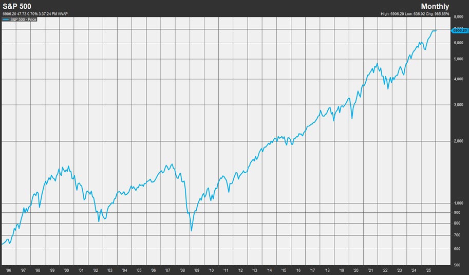 There are obvious parallels between 2025 and the late 1990s. Now as then we are somewhere in the middle of a massive technology product adoption cycle with unknowable consequences. Investors are rightly exuberant about the enormous spending and open-ended potential of AI. But there are also respected voices urging caution. Stocks aren’t cheap and after three years of outstanding gains, shouldn’t we be cautious?