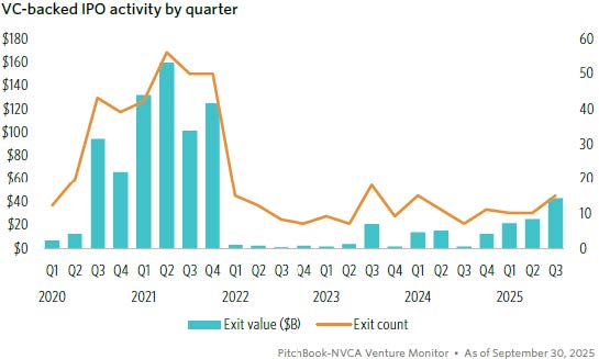 While still relatively low, IPO activity has been showing a little improvement recently. Companies continue to remain private for longer, with PitchBook now estimating that over 40% of unicorns raised their first round of venture capital funding over a decade ago6. If the companies decide to go public, we could see a massive surge in both the IPO count and, more importantly, IPO exit values.