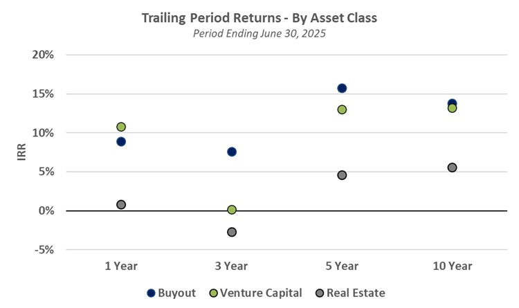 Through the first six months of 2025, private markets continue to produce positive results, albeit paltry in comparison to the broader public equity markets. On a year-to-date basis, based on the quarter ending June 30, 2025, each segment of the private markets posted positive results1 with the best performers buyout, venture capital (particularly late stage focused funds), infrastructure and private credit managers. Real assets (energy, real estate and timber) returns have been lackluster thus far in 2025 as macro headwinds continue to weigh on sentiment for many of the downstream consumers / owners of real estate and natural resources assets. Interestingly, in the near term, European private equity is outperforming the U.S. on a YTD basis by a significant margin (+10.9% in buyout and ~+4.0% in venture capital).