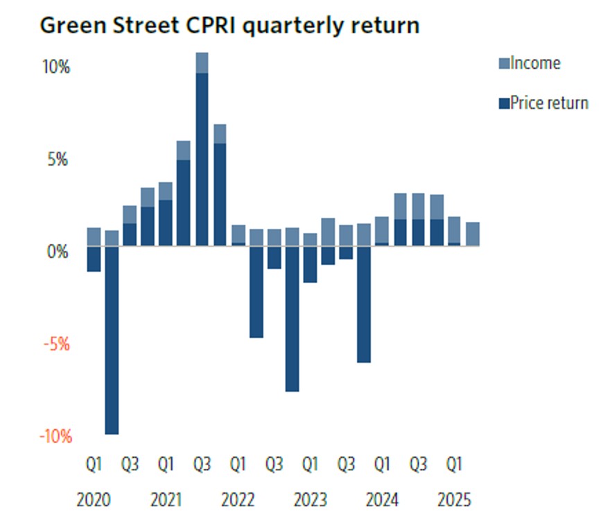 Real estate returns are comprised of two main sources: capital appreciation and income. While the income component is typically stable, capital appreciation is more volatile and can drive ultimate results, especially for value-added and opportunistic strategies. As seen in the chart below8, 2025 may end up being the year of support for North American real estate as prices seemed to find a floor: