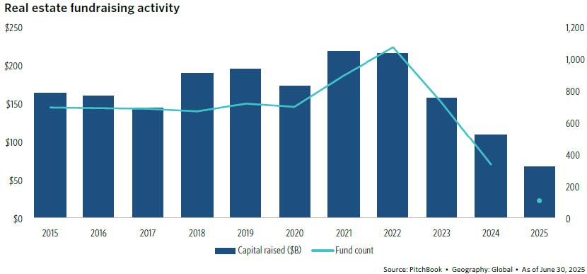 Unfortunately for real estate managers, we have not been alone in our views. According to recent data from PitchBook9, 2025 marks the third consecutive year of a decline in fundraising: