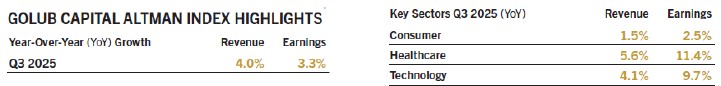 On a positive note, Year-Over-Year (“YoY”) growth in revenue and earnings have remained positive through the first three quarters of 2025. Key takeaways at the underlying sector levels include: i) revenue growth in the consumer sector is more muted vs. the prior year and ii) continued resilience seen in the healthcare and technology sectors.