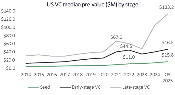 Valuations for early and late-stage VC transactions continue to climb, with the significant increase in the late-stage market being driven by AI companies.