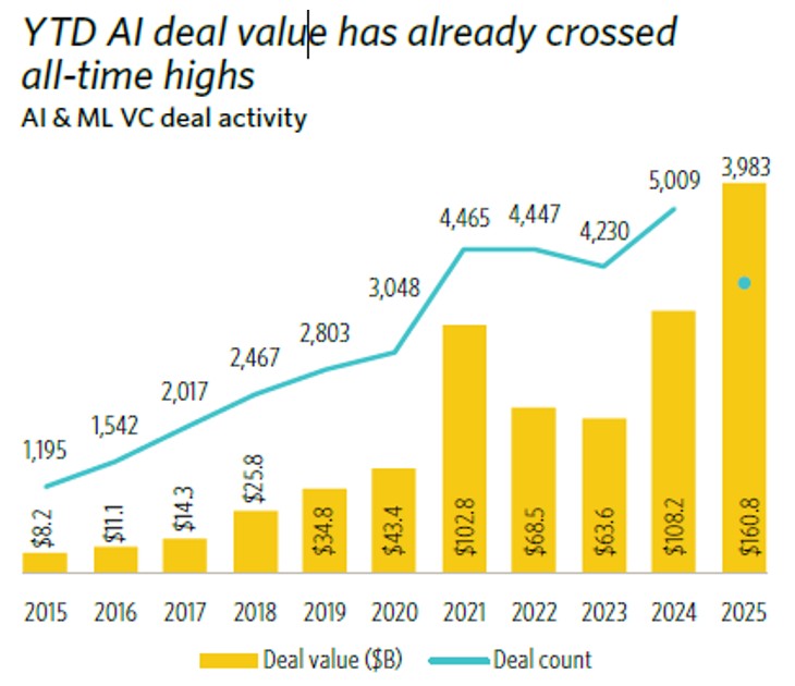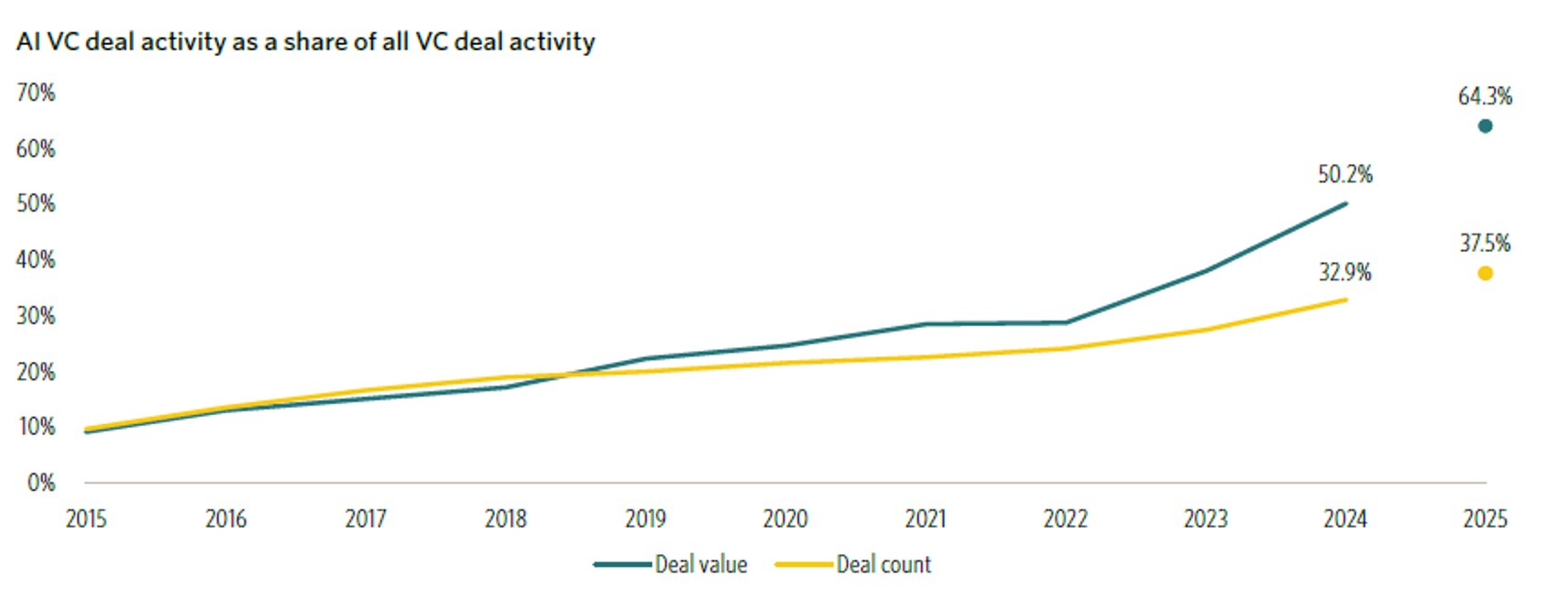 According to research by PitchBook5, “Investor conviction has been increasingly concentrated in AI & machine learning (ML). This sector accounted for 64.3% of venture deal value on a YTD basis, despite representing only 37.5% of deal count”: