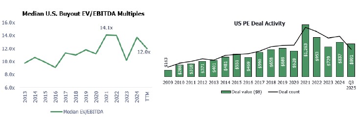 Based on the most recent data available from PitchBook4, valuation multiples in the U.S. buyout segment remained elevated through the end of 2024. Despite higher valuations, deal activity is up in 2025 as lower borrowing costs are providing some support for new deal activity.